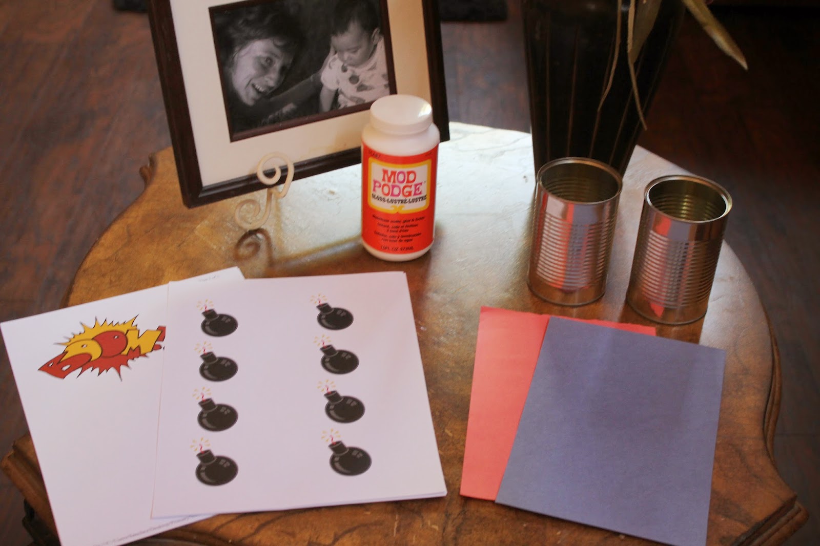 2 soup cans with labels removed, 2 different colors of construction paper, Mod Podge & 2 copies of the word BOOM: Just click, save and print mine posted above. You will also need to put together some cards with your review ideas on the back. You can click, save and print the bombs I used here: